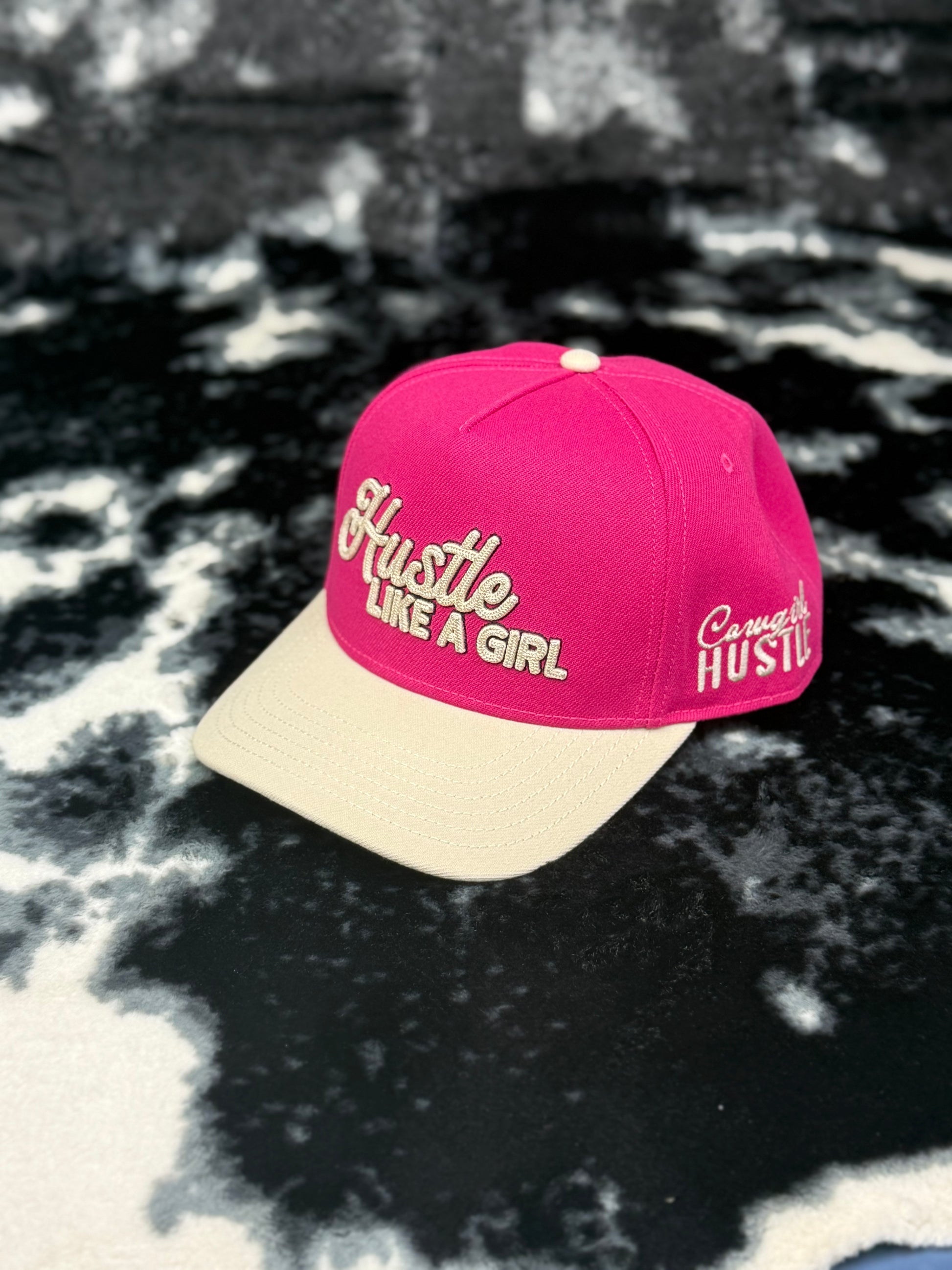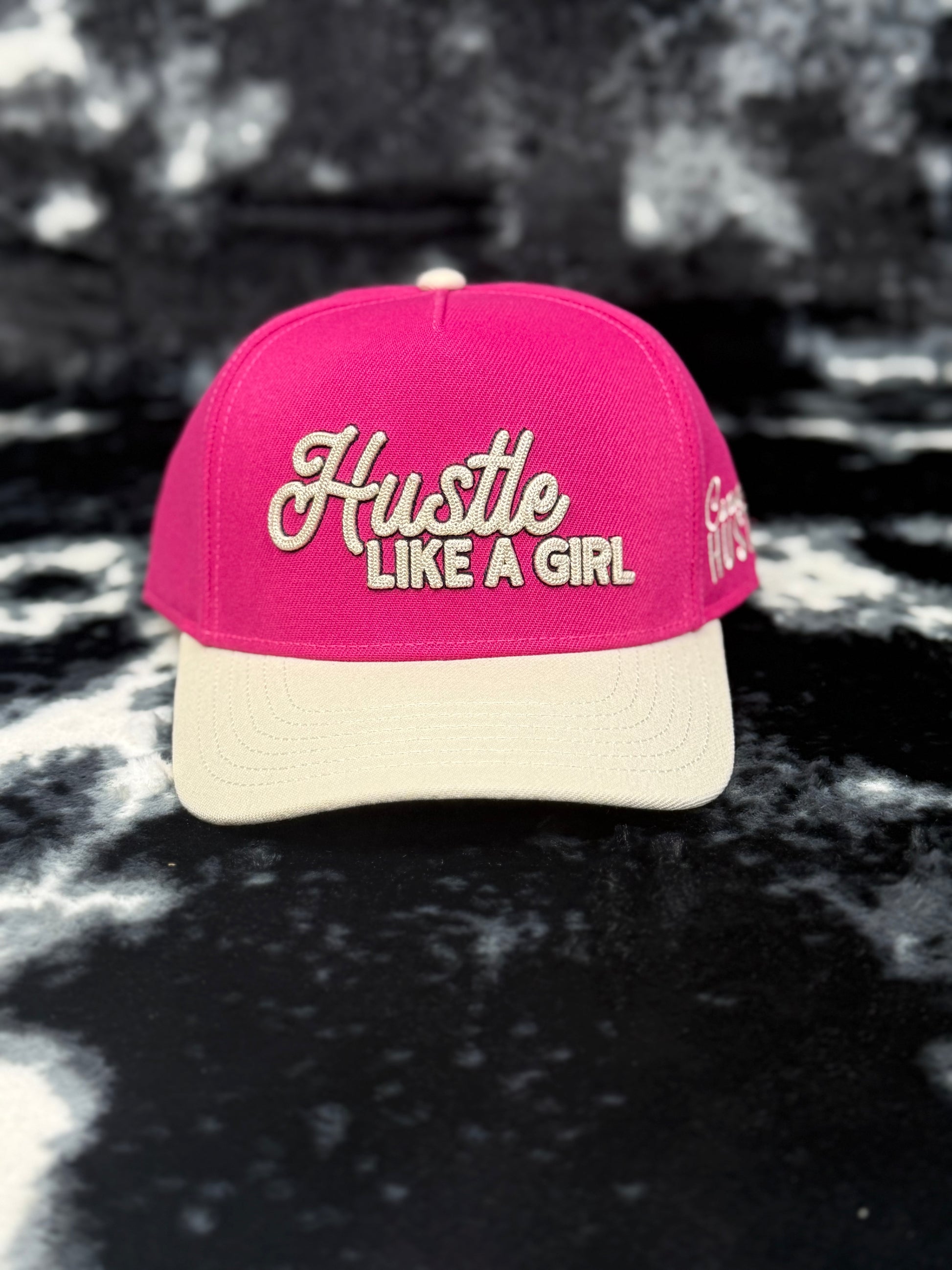 This 6 panel, two toned hat is sure to be a mantra for all that you should 'Hustle like a girl'. There is an adjustable back to fit most!